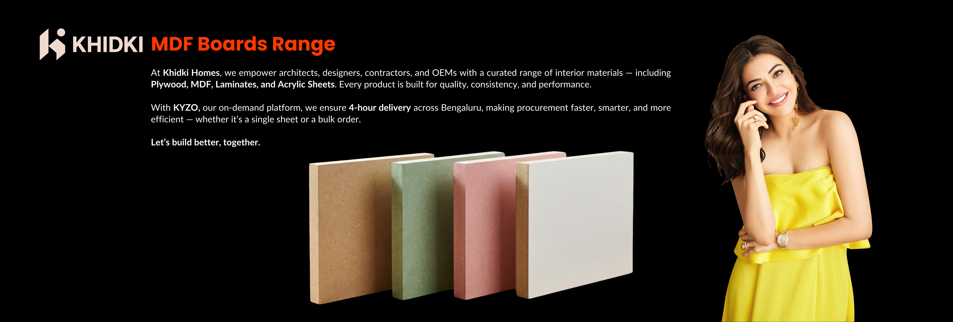 Khidki Homes is a building and interior materials store plus sourcing platform that supplies plywood, laminates, boards, hardware, and allied materials to contractors, interior designers, OEMs, and builders in Bangalore and Hyderabad.